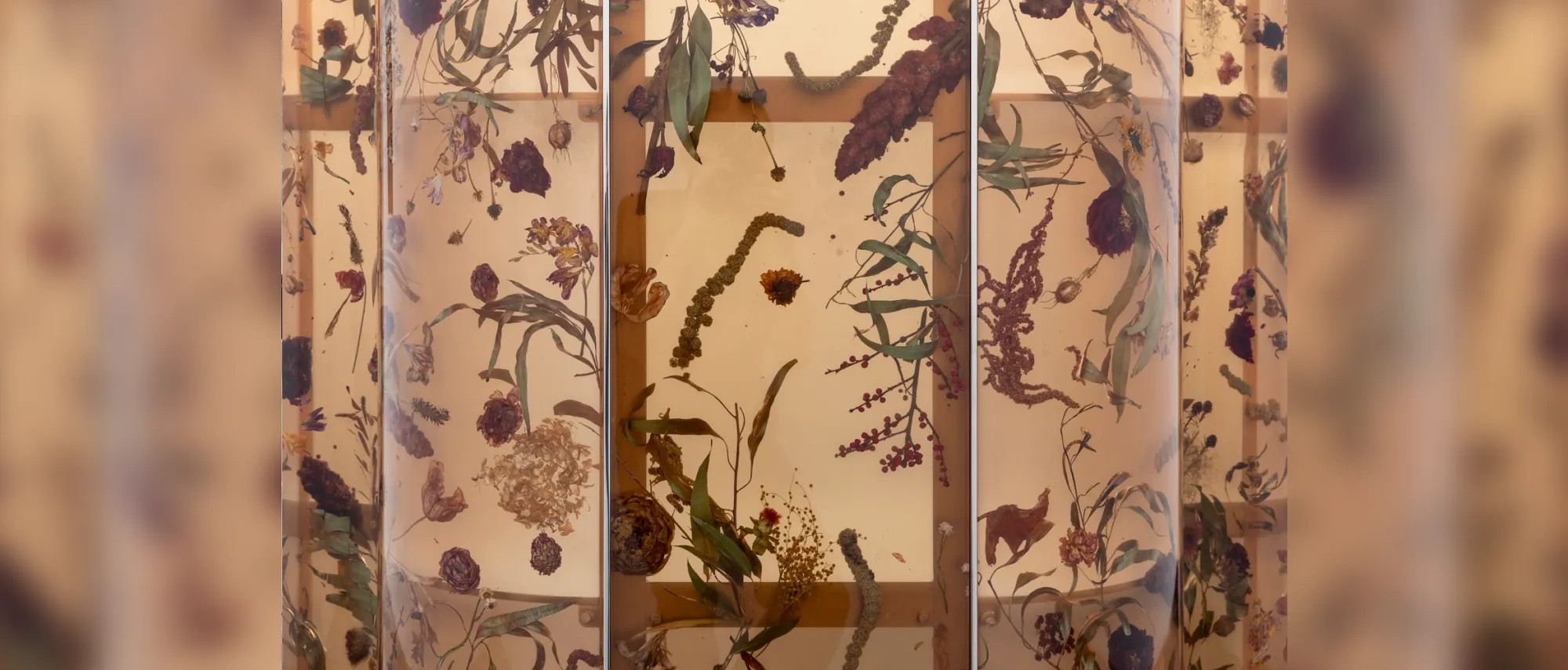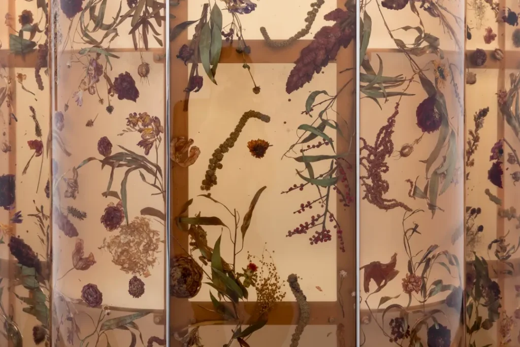 The work draws inspiration from indicator plants (axiophytes) growing in Perrier-Jouët’s vineyards in Épernay, focusing on grapevines, birthwort, and clover. Encased in Rusak’s unique resin technique, the terroir of Champagne is transformed into a contemporary herbarium.